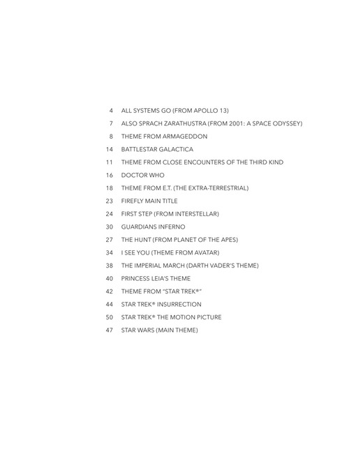 18 seleções estelares para piano solo de vários filmes ambientados no espaço sideral. Battlestar Galactica, Doctor Who, E.T. (The Extra-Terrestrial), Guardians of the Galaxy Vol. 2, Star Trek®, Star Wars, e outras!!!