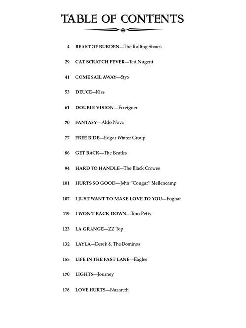 Transcrições para guitarra na partitura e tablatura; Beast of Burden • Cat Scratch Fever • Come Sail Away • Get Back • Hurts So Good • La Grange • Layla • Rock 'n Me • The Stroke • Tie Your Mother Down • 25 or 6 to 4 • Won't Get Fooled Again • e outras!!!