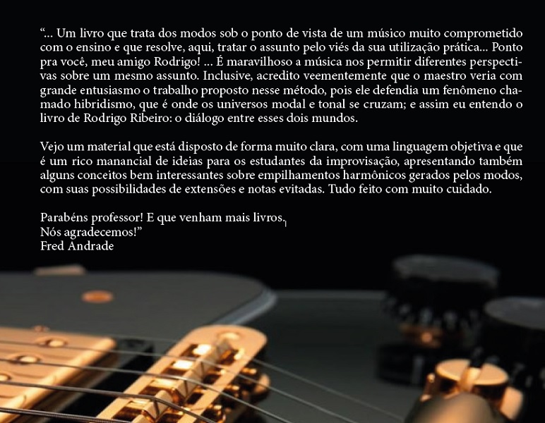 Um livro que trata dos modos sob o ponto de vista de um músico muito comprometido com o ensino e que resolve, aqui, tratar o assunto sob o viés da sua utilização prática. Com mais de 20 anos de experiência didática, o guitarrista e professor Rodrigo Ribeiro elaborou este método com muito cuidado e responsabilidade, para que o estudante aprenda os modos gregos maiores (assunto tão importante aos guitarristas) sem lacunas de informação. O material é divido em sete partes, "passo a passo", de forma muito clara, com uma linguagem objetiva e que é um rico manancial de ideias para os estudantes de improvisação, apresentando também alguns conceitos bem interessantes sobre empilhamentos harmônicos gerados pelos modos, com suas possiblidades de extensões e notas evitadas.