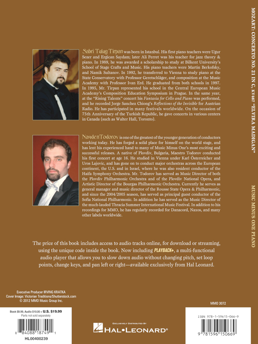 This justifiably famous piano concerto, with its gorgeous Andante theme, became a popular hit when it was used in the film Elvira Madigan. It features lush melodies orchestrated in Mozart's inimitable style – graceful and elegant pianism throughout. The classical piano concerto at its height! Includes a printed music score with informative historical liner notes; and demonstration and backing tracks online. The audio is accessed using the unique code inside each book and can be streamed or downloaded. The audio files include PLAYBACK+, a multi-functional audio player that allows you to slow down audio without changing pitch, set loop points, change keys, and pan left or right. The concerto is voluminously indexed for your practice and performance convenience.