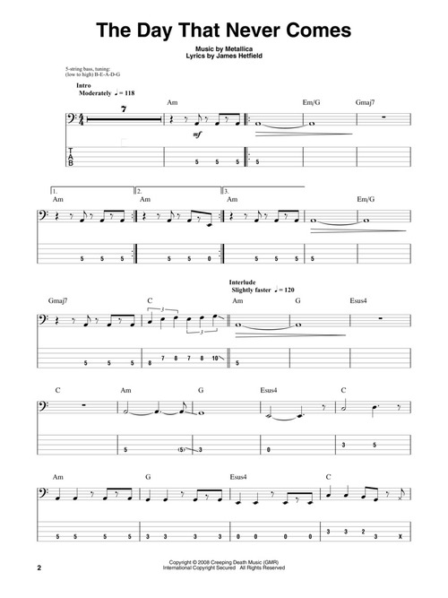 A série Bass Play-Along Series vai ajudá-lo a tocar as suas canções favoritas de forma rápida e fácil. Basta seguir a partitura ou a tablatura, ouvir o áudio para sentir como soa o som do Baixo e depois tocar junto utilizando a faixa de play-back. A melodia e a letra também estão escritas caso você queira cantar. As faixas de áudio estão disponíveis online, juntamente com um player digital (Playback+) que permite alterar o andamento sem alterar o tom, escolher trechos específicos para tocar, além de balanço direita/esquerda. Incluindo: The Day That Never Comes • Enter Sandman • Frantic • Fuel • King Nothing • Moth into Flame • Nothing Else Matters • The Unforgiven.