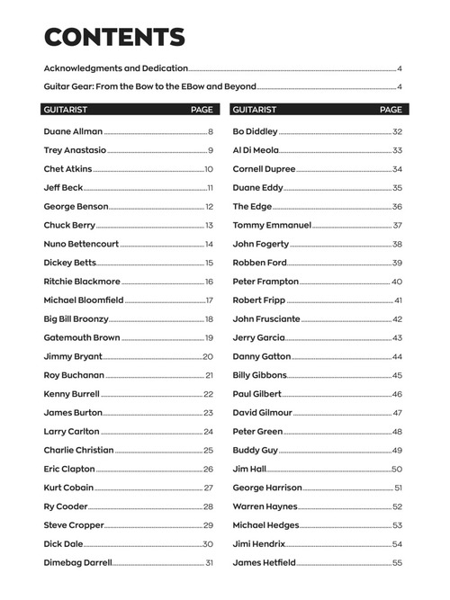 O historiador musical Dave Rubin analisa os equipamentos, afinações, licks e vidas dos 100 melhores guitarristas neste exclusivo pacote de livro / áudio. Inclui fotos raras, bios, partitura e tablatura e demonstrações de áudio de cada lick no livro! Aprenda a mágica por trás dos mestres, incluindo: Duane Allman Jeff Beck Chuck Berry Eric Clapton Bo Diddley Tommy Emmanuel Robben Ford Buddy Guy Jimi Hendrix James Hetfield Robert Johnson Mark Knopfler Yngwie Malmsteen Pat Metheny • Django Reinhardt • Randy Rhoads • Carlos Santana • Joe Satriani • Slash • Steve Vai • Stevie Ray Vaughan • Angus Young • Frank Zappa • e muito mais.