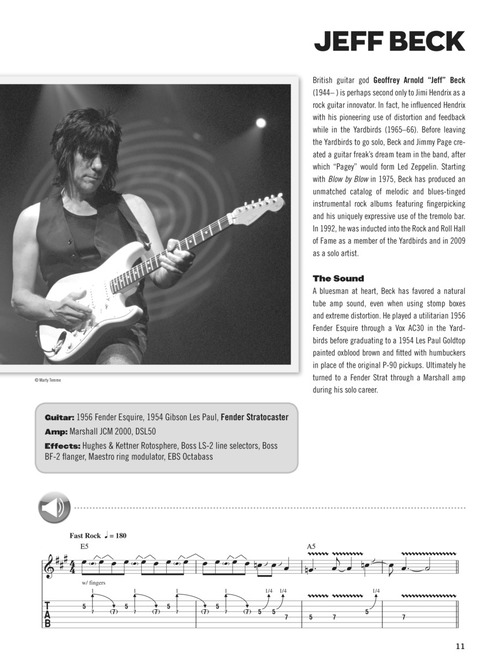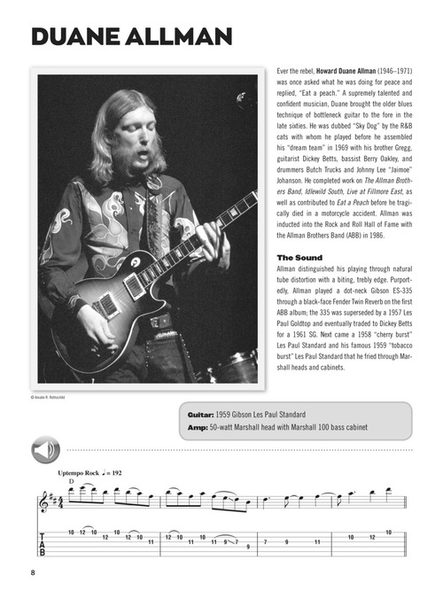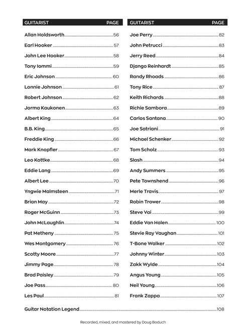 Music historian Dave Rubin surveys the gear, tones, licks and lives of 100 top guitarists in this exclusive book/audio pack. Includes rare photos, bios, tablature and audio demonstrations of every lick in the book! Learn the magic behind the masters, including: Duane Allman • Jeff Beck • Chuck Berry • Eric Clapton • Bo Diddley • Tommy Emmanuel • Robben Ford • Buddy Guy • Jimi Hendrix • James Hetfield • Robert Johnson • Mark Knopfler • Yngwie Malmsteen • Pat Metheny • Django Reinhardt • Randy Rhoads • Carlos Santana • Joe Satriani • Slash • Steve Vai • Stevie Ray Vaughan • Angus Young • Frank Zappa • and more.
