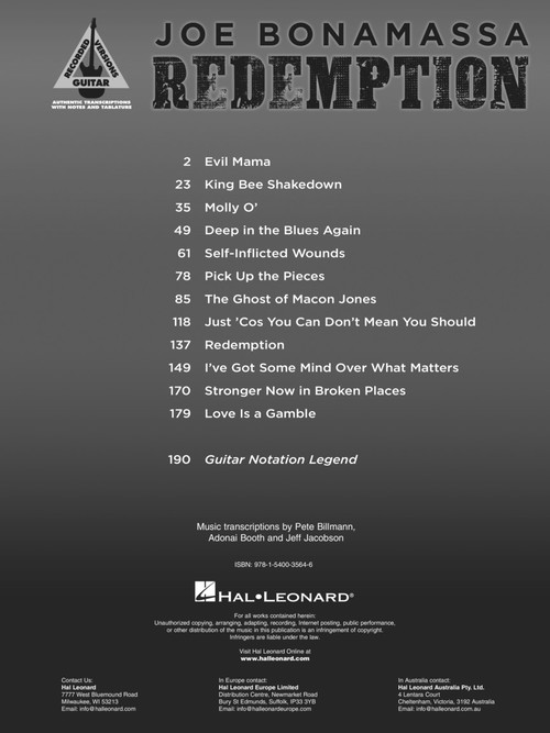 A dozen tracks from the 2018 album release by blues rock guitar god Joe Bonamassa are arranged in note-for-note guitar transcriptions in standard notation and tab in this collection.