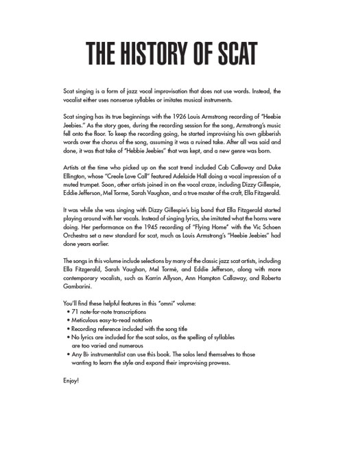 Instrumentalists, get ready for some fun. For the first time ever, you can play the exact lines as scatted by some of the greatest jazz legends of all time: Karrin Allyson, Louis Armstrong, Ann Hampton Calloway, Ella Fitzgerald, Roberta Gambarini, Dianne Reeves, Mel Tormé, Sarah Vaughan, and more! Of course singers can get in on the fun, too, with this unique songbook. Omnibooks are comprehensive collections featuring the most accurate note-for-note transcriptions right from the recordings and are spiral-bound for easy usability. They also include chord symbols, metronome markings and record information. This Scat Omnibook features 60 songs exactly as they were recorded. Includes an artist index and introduction on the history of scat vocals.