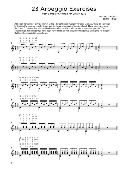 Right hand arpeggios are essential cornerstones for the development of classical and fingerstyle guitar technique. The study of arpeggios will enable the student of the guitar the opportunity to observe and refine technique and musicianship while playing beautiful music. Includes: 23 Arpeggio Exercises (from Complete Method for Guitar by Carcassi) • Grazioso (Guiliani) • Ländler Op. 9, No. 4 (Mertz) • O Mio Babbino Caro (Puccini) • Prelude (J.S. Bach) • Recuerdos de la Alhambra (Tárrega) • Spanish Romance (Anonymous) • Study Op. 35, Nos. 9, 13 & 22 (Sor) • and much more.