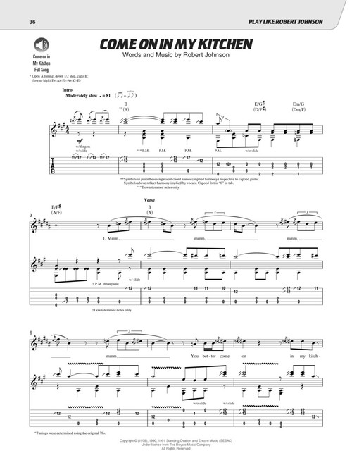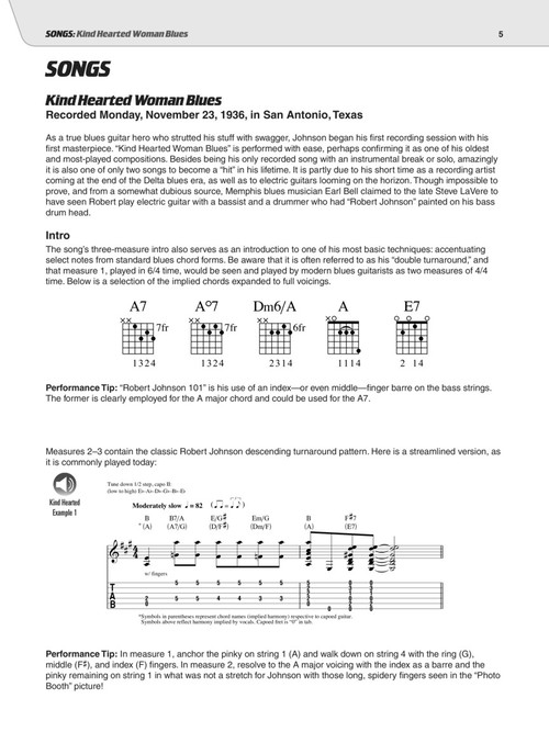 Study the trademark songs, licks, tones and techniques of the King of the Delta Blues Singers, Robert Johnson. This comprehensive book and audio teaching method provides detailed analysis of his guitars, techniques, styles, songs, licks, riffs and much more. You'll learn everything you need to know about Johnson's legendary guitar playing, as captured on his 29 known recording from 1936-7. Audio is accessed online using the unique code inside the book and can be streamed or downloaded. The audio files include PLAYBACK+, a multi-functional audio player that allows you to slow down audio without changing pitch, set loop points, change keys, and pan left or right.