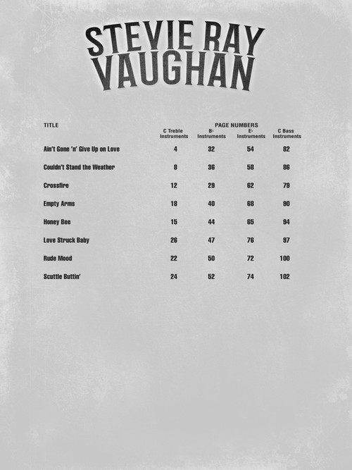 Esta série traz todos os temas transcritos para instrumentos em C, Eb, Bb e Clave de Fá. No áudio, disponível online, cada tema tem duas gravações; uma faixa completa com a melodia e uma segunda faixa com o mesmo tema, porém sem a melodia, somente o play-back para que você possa tocar junto. As gravações são de excelente qualidade, mostrando a real atmosfera blues, incluindo gaitas, guitarras e muitos elementos nos arranjos. As faixas de áudio estão disponíveis online, juntamente com um player digital multifuncional (Playback+), que permite alterar o andamento sem alterar o tom, definir pontos específicos para tocar (loop), alterar o tom, além de balanço direita/esquerda. Ain't Gone 'n' Give up on Love • Couldn't Stand the Weather • Crossfire • Empty Arms • Honey Bee • Love Struck Baby • Rude Mood • Scuttle Buttin'.