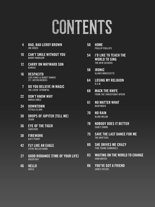 25 sucessos bastante conhecidos para gaita, na partirua e tablatura de gaita. Bad, Bad Leroy Brown (Jim Croce) • Carry on Wayward Son (Kansas) • Don't Know Why (Norah Jones) • Eye of the Tiger (Survivor) • Good Riddance (Time of Your Life) (Green Day) • Hello (Adele) • Ironic (Alanis Morissette) • Losing My Religion (R.E.M.) • No Rain (Blind Melon) • Save the Last Dance for Me (The Drifters) • Waiting on the World to Change (John Mayer) • You've Got a Friend (James Taylor) • e outras!