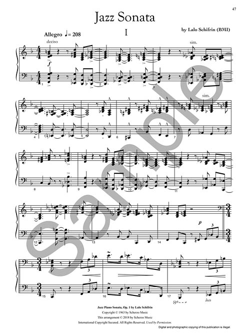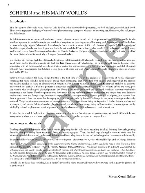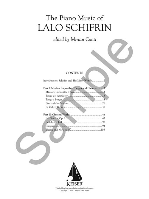 Lalo Schifrin, the internationally renowned composer of classical, film and television scores, in collaboration with fellow Argentinian pianist Yamaha artist Mirian Conti, produced the most comprehensive recording of his works for piano solo, including several world premières. The album's release was heralded by the Consulate General of Argentina in New York in November of 2017, under the Auspices of Yamaha Artist Services with a reception in honor of Schifrin's music. This exclusive publication makes all the works from this landmark recording available to pianists worldwide, and includes a unique arrangement of the famous theme to Mission: Impossible by the composer himself. “It is truly a joy to perform Lalo Schifrin's piano music, and to be able to understand how he can easily travel from one genre to another in such a masterful and virtuoso way: from jazz, to tangos, to classical, and all extremely pianistic...We are both two Argentines on a mission.” –Mirian Conti. Contents: La Calle y la Luna • Danza de los Montes • Jazz Piano Sonata, Op. 1 • Lullaby for Jack • Mission: Impossible Theme • Pampas • Tango A Borges • Tango del Atardecer • Theme and Variations.