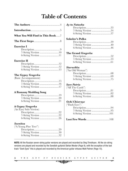 There are numerous publications on the art of flamenco guitar, and on the so-called “gypsy jazz” (the style of Django Reinhardt) guitar. Associated mainly with the Russian seven-string guitar, the art of the Russian-Romany guitarists is barely known in the west and unfortunately is almost lost in Russia itself. This book is designed to introduce guitarists to this specific gypsy style. Follow along as the masters of Russian Gypsy Guitar lead you through exercises and traditional songs, transcribed for both 6 and 7-string guitars. It includes access to audio files online to help you understand and play each piece with proper timing and inflection.