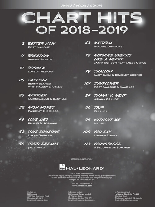18 grandes sucessos de 2018/2019 arranjados para piano/voz e acordes para violão; incluindo: Eastside (Benny Blanco with Halsey & Khalid) • Happier (Marshmello feat. Bastille) • High Hopes (Panic! At the Disco) • Natural (Imagine Dragons) • Shallow (Lady Gaga & Bradley Cooper) • Sunflower (Post Malone & Swae Lee) • Thank U, Next (Ariana Grande) • Without Me (Halsey) • Youngblood (5 Seconds of Summer) • e outras!