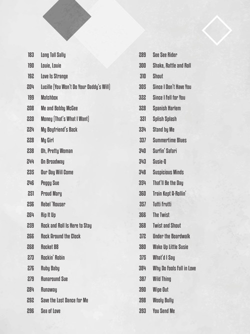 Uma coleção bastante abrangente sobre o Rock 'N 'Roll. Transcrições para piano/voz e acordes para violão; incluindo: All I Have to Do Is Dream • Blueberry Hill • Can't Help Falling in Love • Daydream Believer • Earth Angel • Fun, Fun, Fun • Great Balls of Fire • Hello Mary Lou • I Heard It Through the Grapevine • Louie, Louie • My Girl • Oh, Pretty Woman • Proud Mary • Rock Around the Clock • Shout • The Twist • Wild Thing • Wooly Bully • e outras!!!