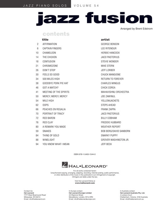 Arranjos para piano solo; incluindo: Chameleon (Herbie Hancock) • Don't Stop (Jeff Lorber) • Feels So Good (Chuck Mangione) • 500 Miles High (Return to Forever) • Goodbye Pork Pie Hat (Charles Mingus) • Mercy, Mercy, Mercy (Joe Zawinul) • Peaches en Regalia (Frank Zappa) • Portrait of Tracy (Jaco Pastorius) • A Remark You Made (Weather Report) • You Know What I Mean (Jeff Beck) • e outras!!!