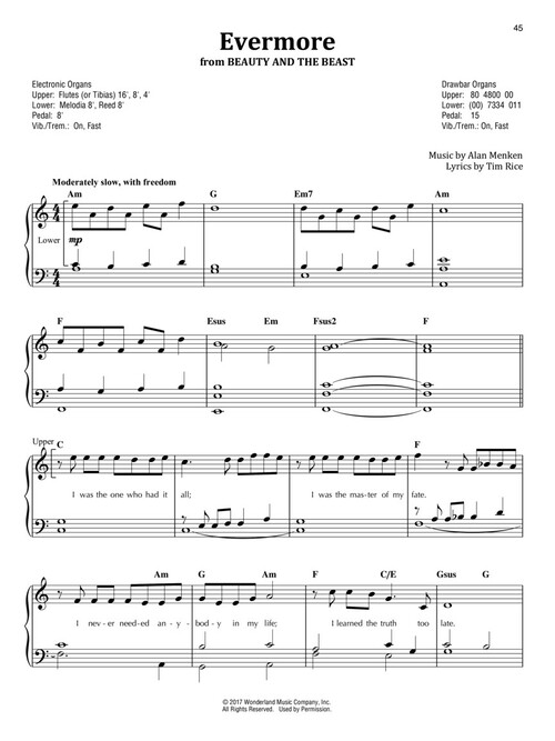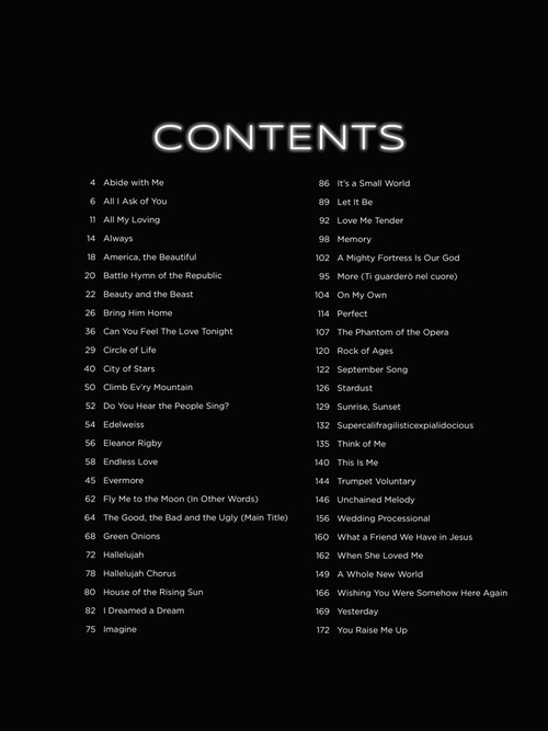 Arranjos facilitados para órgão; incluindo: Abide with Me • Battle Hymn of the Republic • City of Stars • Eleanor Rigby • Green Onions • Hallelujah Chorus • It's a Small World • Love Me Tender • Memory • On My Own • The Phantom of the Opera • Sunrise, Sunset • Trumpet Voluntary • Wedding Processional • You Raise Me Up • e outras!!!