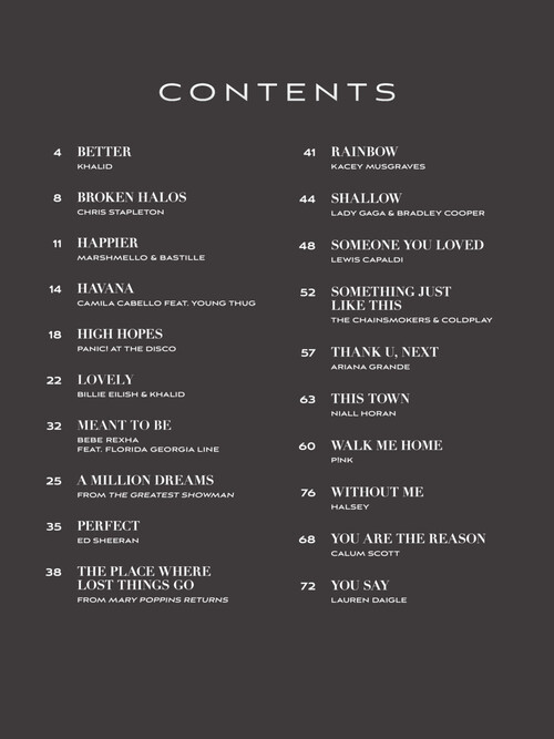 Arranjos para piano solo de 20 grandes sucessos, incluindo: Happier (Marshmello feat. Bastille) • Havana (Camila Cabello feat. Young Thug) • High Hopes (Panic! At the Disco) • Perfect (Ed Sheeran) • Rainbow (Kacey Musgraves) • Shallow (Lady Gaga & Bradley Cooper) • You Are the Reason (Calum Scott) • You Say (Lauren Daigle) • e outros!!!