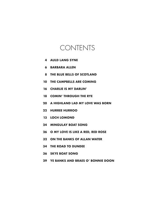 Transcrições para piano solo de 15 canções tradicionais da Escócia; incluindo: Auld Lang Syne • Barbara Allen • The Blue Bells of Scotland • The Campbells Are Coming • Charlie Is My Darlin' • Comin' Through the Rye • A Highland Lad My Love Was Born • Hurree Hurroo • Loch Lomond • Mingulay Boat Song • O My Love Is like a Red, Red Rose • On the Banks of Allan Water • The Road to Dundee • Skye Boat Song • Ye Banks and Braes O' Bonnie Doon.