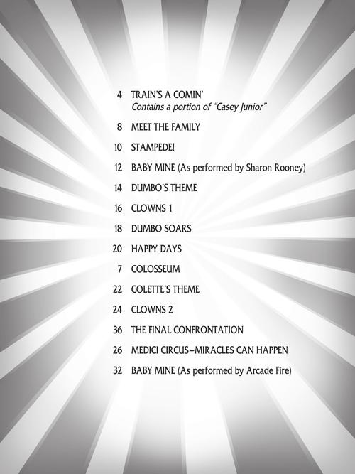 Arranjos para piano solo; incluindo: Baby Mine (both Sharon Rooney and Arcade Fire versions) • Clowns 1 • Clowns 2 • Colette's Theme • Colosseum • Dumbo Soars • Dumbo's Theme • The Final Confrontation • Happy Days • Medici Circus-Miracles Can Happen • Meet the Family • Stampede! • Train's a Comin'.