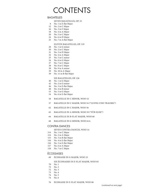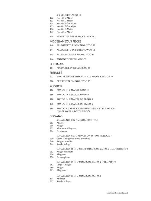 Este volume abrangente contém 134 peças do nível Intermediário Precoce ao Avançado Precoce, incluindo bagatelas completas de Beethoven, várias danças, sonatinas, conjuntos de variações selecionadas e algumas de suas sonatas mais populares. Conteúdo: Bagatelles, Opp. 33, 119, 126, WoO 52, 54, 56, 59, 60, 61a
