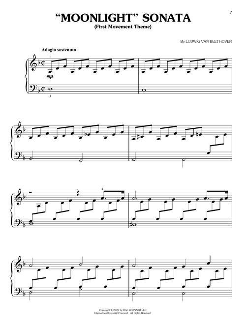 19 of Beethoven's best in easy piano arrangements for developing pianists. Includes: Für Elise, WoO 59 • Minuet in G Major • Piano Sonata No. 14 in C# Minor (“Moonlight”) Op. 27, No. 2, First Movement Theme • Ode to Joy • Overture to Egmont • Theme from Pathetique Sonata • Turkish March • and more.