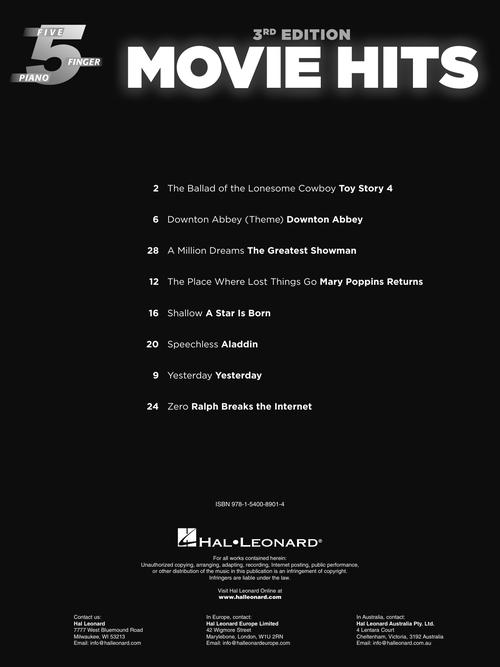 Eight hit songs from eight hit films in accessible 5-finger piano arrangements: The Ballad of the Lonesome Cowboy (from Toy Story 4) • Downton Abbey (Theme) • A Million Dreams (from The Greatest Showman) • The Place Where Lost Things Go (from Mary Poppins Returns) • Shallow (from A Star Is Born) • Speechless (from Aladdin) • Yesterday • Zero (from Ralph Breaks the Internet).