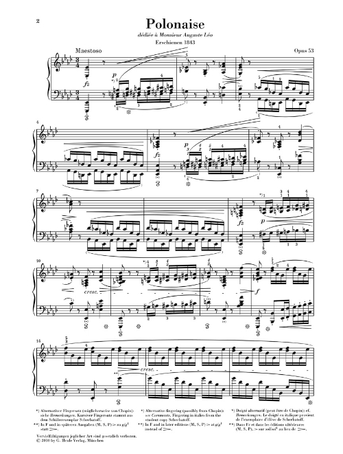 Along with the beautiful facsimile edition of the autograph score to be published on the occasion of the 200th anniversary of Frédéric Chopin's birth (HN 3221), Henle is also publishing a completely revised Urtext edition of this popular work. Norbert Müllemann, who was responsible for the revisions of the “Préludes” and “Ballades,” closely examined the musical text using the currently available sources and provided an informative preface and added footnotes to the musical text which contain possible performance alternatives. The Polonaise, also known as the “Heroic” due to its proudly pacing theme, is amongst Chopin's most forceful bravura pieces, in particular on account of its breakneck ostinato octaves in the middle section.