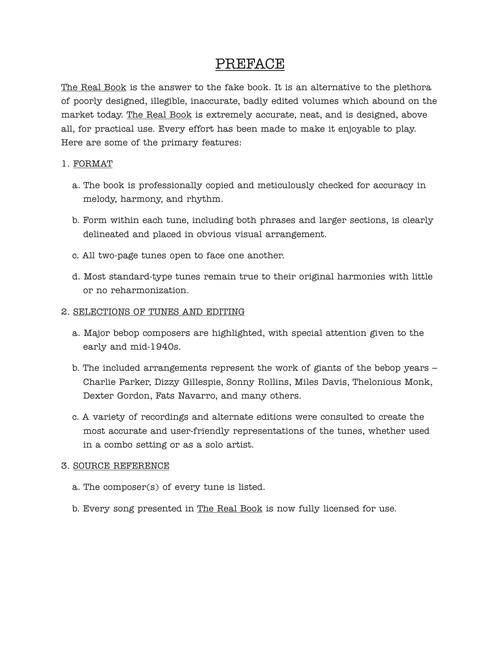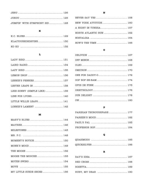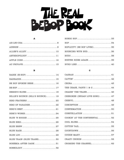 Sua nova bíblia oficial do bebop! Mais de 200 clássicos arranjados para instrumentos Eb no estilo Real Book (Melodia e Harmonia). Incluindo Anthropology • Au Privave • Be-Bop • Boneology • Boplicity (Be Bop Lives) • Byrd Like • Cherokee (Indian Love Song) • Confirmation • Donna Lee • Doxy • Epistrophy • 52nd Street Theme • Four • Goin' to Minton's • Good Bait • Groovin' High • Hi-Fly • Hot House • In Walked Bud • Jay Bird • Lady Bird • Lennie's Pennies • Moose the Mooche • Move • Oblivion • Oleo • Parisian Thoroughfare • Rosetta • Salt Peanuts • Solar • Teaneck • Tin Tin Deo • Tour De Force • Tricrotism • Wail • Woodyn' You • Yardbird Suite • e muito mais.