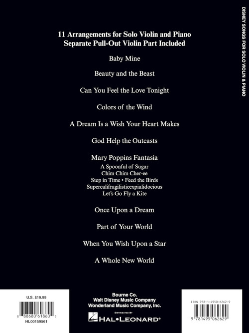 11 arrangements of Disney favorites for violin with piano accompaniment. Songs include: Baby Mine · Beauty and the Beast · Can You Feel the Love Tonight · Colors of the Wind · A Dream Is a Wish Your Heart Makes · God Help the Outcasts · Mary Poppins Fantasia medley · Once upon a Dream · Part of Your World · When You Wish upon a Star · A Whole New World. Includes separate violin part.