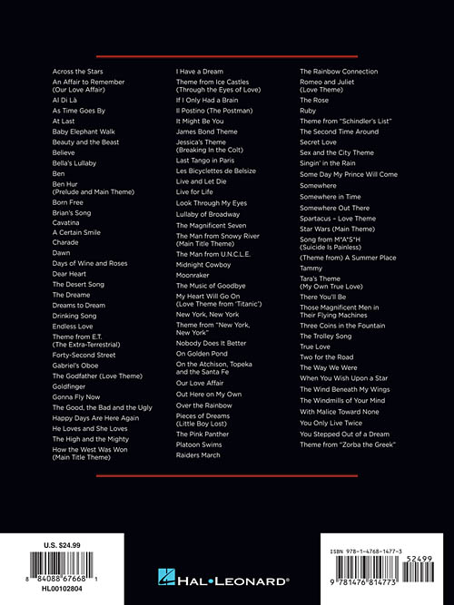 100 beautiful arrangements of standards from the cinema, including: An Affair to Remember (Our Love Affair) · As Time Goes By · Baby Elephant Walk · Beauty and the Beast · Bella's Lullaby · Born Free · Brian's Song · Endless Love · Theme from E.T. (The Extra-Terrestrial) · The Godfather (Love Theme) · Goldfinger · James Bond Theme · Live and Let Die · The Magnificent Seven · My Heart Will Go On (Love Theme from 'Titanic') · Theme from New York, New York · Over the Rainbow · The Pink Panther · Raiders March · The Rainbow Connection · The Rose · Singin' in the Rain · Star Wars (Main Theme) · Song from M*A*S*H (Suicide Is Painless) · The Trolley Song · The Way We Were · The Wind Beneath My Wings · and more.