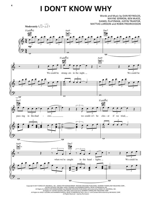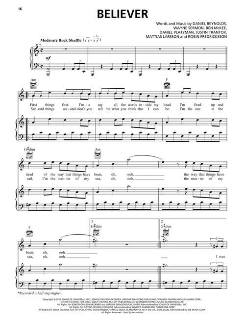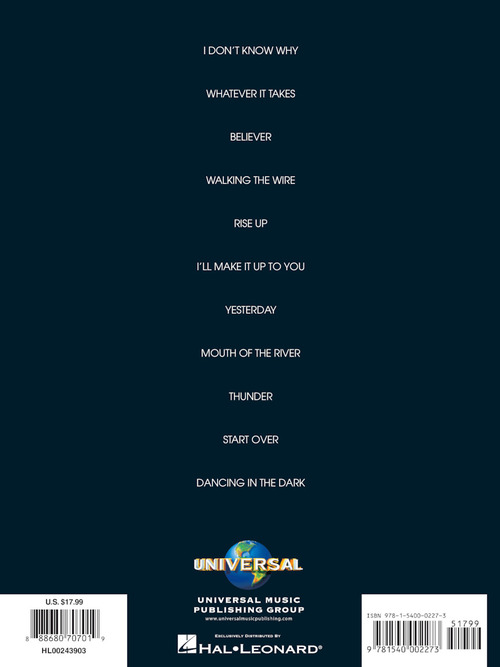 Este terceiro álbum de estúdio da banda de rock Imagine Dragons de Nevada foi lançado no verão de 2017 e alcançou o segundo lugar nas paradas de álbuns da Billboard® 200. Nosso fólio correspondente inclui arranjos de piano, vocal e guitarra para os singles "Believer" e "Thunder", além de mais 9 músicas: Dancing in the Dark · I Don't Know Why · I'll Make It up to You · Mouth of the River · Rise Up · Start Over · Walking the Wire · Whatever It Takes · Yesterday.