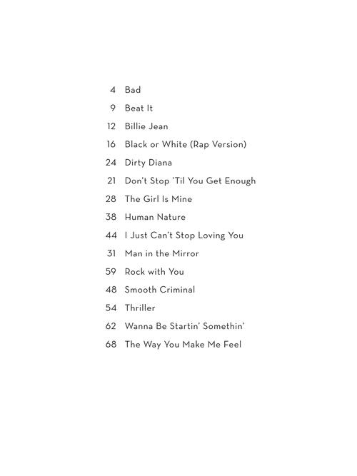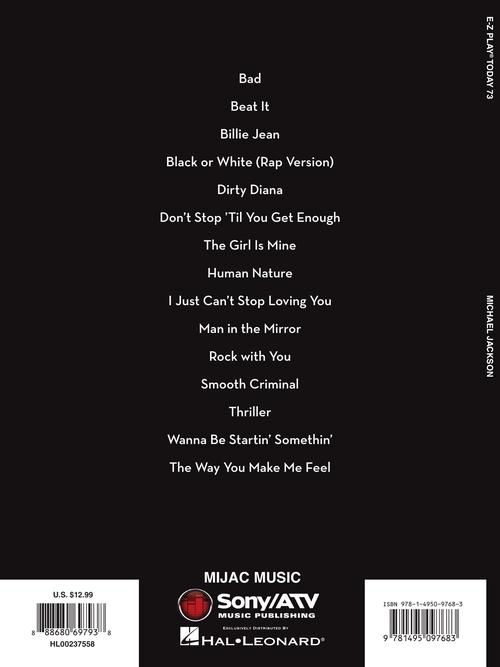15 great hits presented in our patented E-Z Play Today notation with note-names in the note heads and lyrics. Songs include: Bad · Beat It · Billie Jean · Black or White (Rap Version) · Dirty Diana · Don't Stop 'Til You Get Enough · The Girl Is Mine · Human Nature · I Just Can't Stop Loving You · Man in the Mirror · Rock with You · Smooth Criminal · Thriller · Wanna Be Startin' Somethin' · The Way You Make Me Feel.