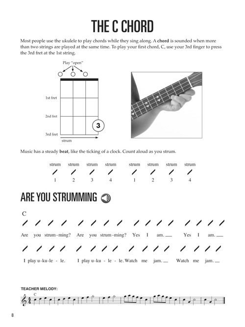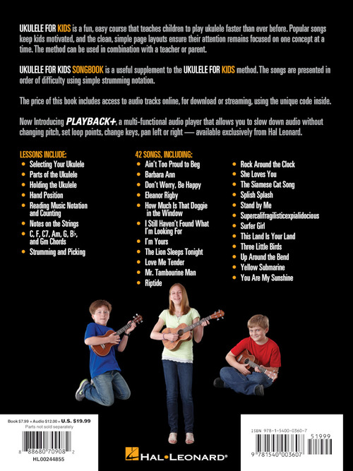 This budget-saving combo pack of the content from the Ukulele for Kids Method Book and Ukulele for Kids Songbook by Chad Johnson is a fun, easy course that teaches children to play ukulele faster than ever before. Popular songs in the method book keep kids motivated, and the clean, simple page layouts ensure their attention remains focused on one concept at a time. The songbook is a useful supplement to the method presenting songs in order of dicculty using simple strumming notation. Access to audio tracks online is included for download or streaming using the unique code inside the book.