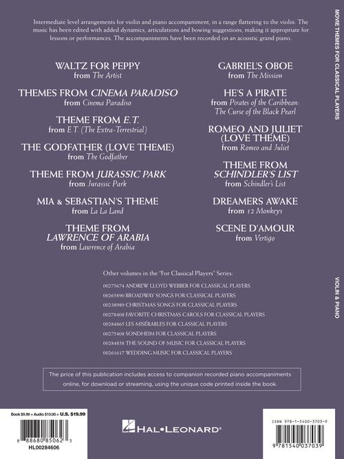 Intermediate level arrangements for solo instruments and piano accompaniment, in a range flattering to each instrument. Each book includes a pull-out solo instrumental part. The music has been edited with added dynamics, articulations, and phrasing, making it appropriate for lessons or performances. The accompaniments have been recorded on an acoustic grand piano and are available online for download or streaming. Includes: Theme from E.T. (The Extra-Terrestrial) · The Godfather (Main Theme) · He's a Pirate (from Pirates of the Caribbean) · Theme from Jurassic Park · Mia & Sebastian's Theme (from La La Land) · The Pink Panther · and more. Audio is accessed online using the unique code inside the book and can be streamed or downloaded. The audio files include PLAYBACK+, a multi-functional audio player that allows you to slow down audio without changing pitch, set loop points, change keys, and pan left or right.