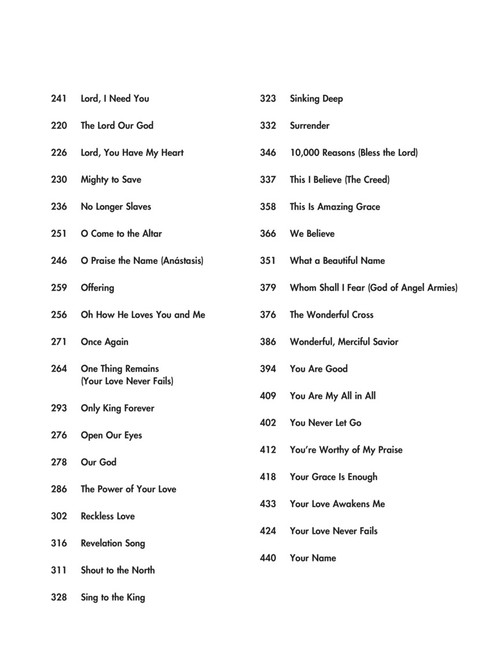 Mais 75 favoritos contemporâneos do culto estão contidos nesta segunda edição atualizada, incluindo: Amazing Grace (My Chains Are Gone) · Blessed Be Your Name · Cornerstone · Everlasting God · Glorious Day · How Great Is Our God · In Christ Alone · Jesus Messiah · The Lion and the Lamb · Mighty to Save · O Come to the Altar · Reckless Love · Surrender · 10,000 Reasons (Bless the Lord) · What a Beautiful Name · Your Grace Is Enough · and more.