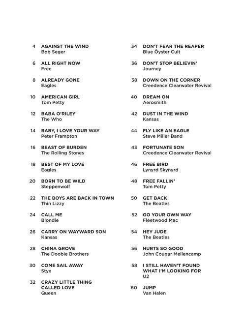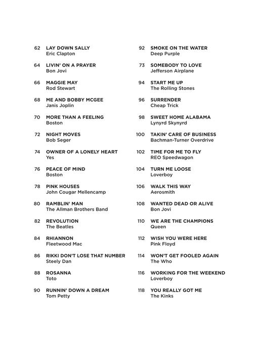 It's super easy! This series features accessible arrangements for piano, with simple right-hand melody, letter names inside each note, basic left-hand chord diagrams, and no page turns. The arrangements also include lyrics. This edition includes 60 timeless songs: Already Gone · Baby, I Love Your Way · Crazy Little Thing Called Love · Don't Stop Believin' · Free Fallin' · Hey Jude · I Still Haven't Found What I'm Looking For · Livin' on a Prayer · More Than a Feeling · Rikki Don't Lose That Number · Start Me Up · Takin' Care of Business · Walk This Way · You Really Got Me · and more.