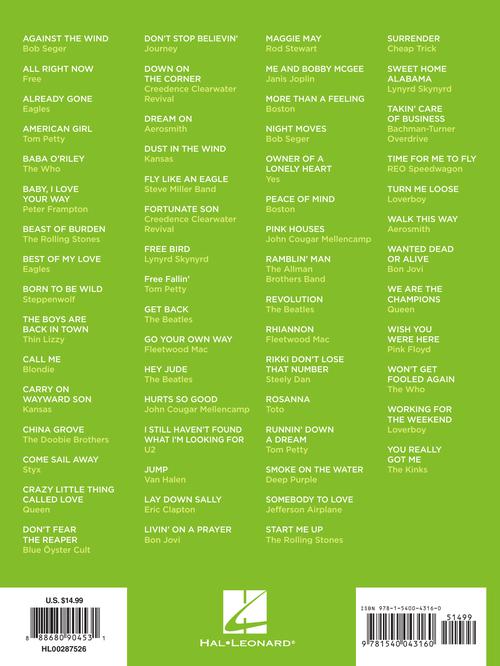 Esta série apresenta arranjos acessíveis para piano, com melodia simples à direita, nomes de letras dentro de cada nota e nenhuma página virada. Os arranjos também incluem letras. Esta edição inclui 60 músicas atemporais: Already Gone · Baby, I Love Your Way · Crazy Little Thing Called Love · Don't Stop Believin' · Free Fallin' · Hey Jude · I Still Haven't Found What I'm Looking For · Livin' on a Prayer · More Than a Feeling · Rikki Don't Lose That Number · Start Me Up · Takin' Care of Business · Walk This Way · You Really Got Me · and more.