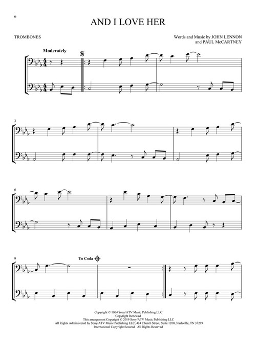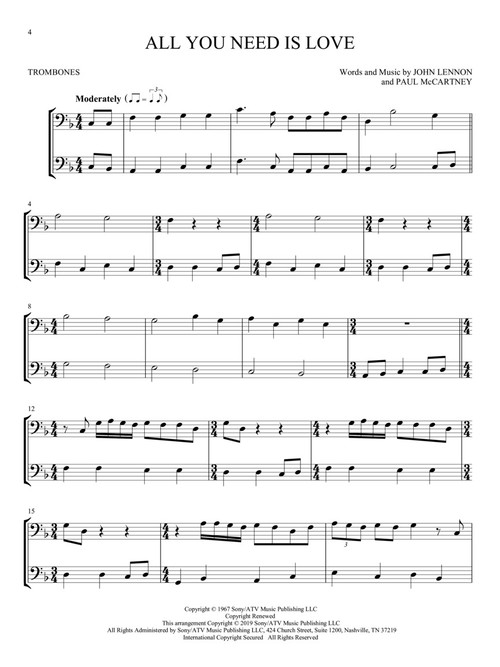 23 favorites from the Fab Four in easy duet arrangements for two instrumentalists are featured in this collection: All You Need Is Love · Eleanor Rigby · Here Comes the Sun · Hey Jude · I Want to Hold Your Hand · Penny Lane · Something · Yellow Submarine · Yesterday · and more. Arrangements work for two of the same instrument or can also be used with the other titles in the same instrument family from this series.
