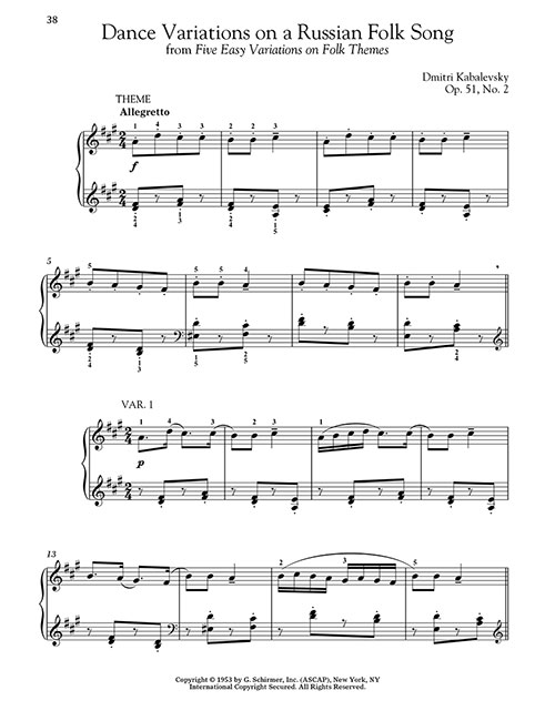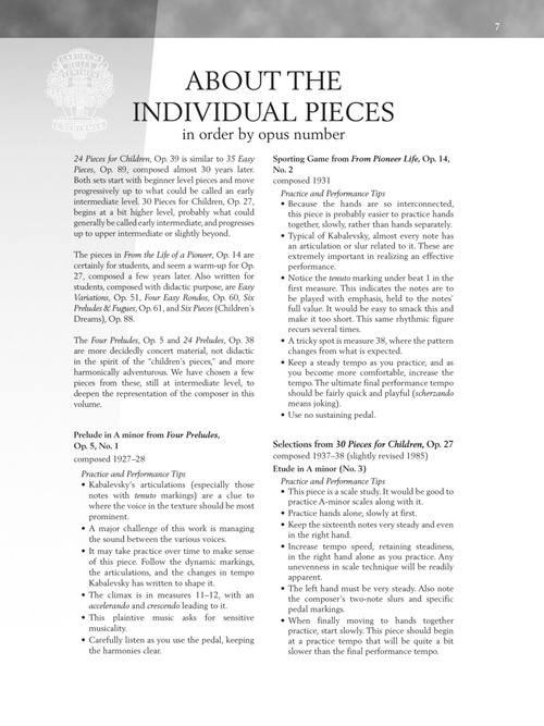 17 pieces from various opus sets in progressive order. Kabalevsky often quoted Russian writer Maxim Gorky that books for children should be the same as for adults, only better. In one volume the miniature masterpieces that Kabalevsky composed for piano students have been grouped by level of difficulty, drawn from various sets. The composer believed that no piece of music, however short and modest, should pass by a child without touching his mind and heart. Contents: Prelude in A minor, Op. 5, No. 1 · Sporting Game, Op. 14, No. 2 · Etude in A minor, Op. 27, No. 3 · A Little Prank, Op. 27, No. 13 · Lyric Piece, Op. 27, No. 16 · Fairy Tale, Op. 27, No. 20 · The Chase, Op. 27, No. 21 · Novelette, Op. 27, No. 25 · Prelude in C Major, Op. 38, No. 1 · Prelude in D-flat Major, Op. 38, No. 15 · Slow Waltz, Op. 39, No. 23 · Dance Variations on a Russian Folk Song, Op. 51, No. 2 · Seven Cheerful Variations on a Slovakian Folk Song, Op. 51, No. 4 · Rondo-Song, Op. 60, No. 3 · Rondo-Toccata, Op. 60, No. 4 · Prelude and Fugue in G Major, Op. 61, No. 1 · Naughty Boys, Op. 88, No. 6