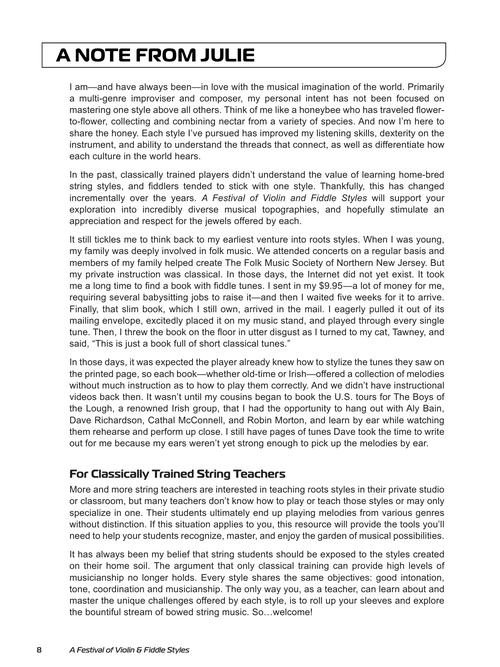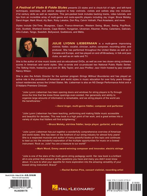 Preface by Jay Ungar, composer of Ashokan Farewell. A Festival of Violin & Fiddle Styles presents 23 styles and is chock full of right- and left-hand techniques, exercises, and advice designed to help violinists, violists and cellists step into inclusive, 21st century skills as well as repertoire. This jam-packed book includes tips from an incredible array of multi-genre and roots-specific players including: Jay Ungar, Bruce Molsky, Darol Anger, Mark Wood, Aly Bain, Roby Lakatos, Don Roy, Calvin Vollrath, Paul Anastasio, and more. Styles include old-time, bluegrass, Cajun, Franco-American, western swing, blues, swing, pop/rock, Irish, Scottish, Shetland Islands, Cape Breton, Hungarian, Ukrainian, Klezmer, Roma, Calentano, Galician, Afro-Cuban, tango, Swedish, Bollywood, Quebecois, and Metis. Online audio includes playing examples of all the fiddle tunes in the book, followed by background music so you can continue to play on your own. Videos include expert instruction on fiddle techniques like bowing, slurs, slides, vibrato, and ornamentation.