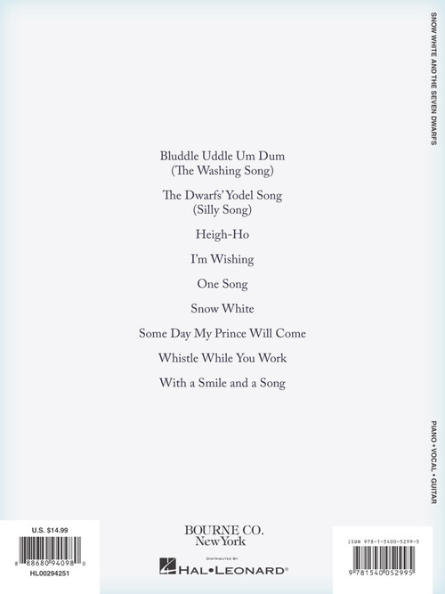 9 songs from the first ever Disney animated feature film, which was released in 1937. This collection includes piano/vocal/arrangements of the songs: Bluddle Uddle Um Dum (The Washing Song) · The Dwarfs' Yodel Song (Silly Song) · Heigh Ho · I'm Wishing · One Song · Snow White · Some Day My Prince Will Come · Whistle While You Work · With a Smile and a Song.