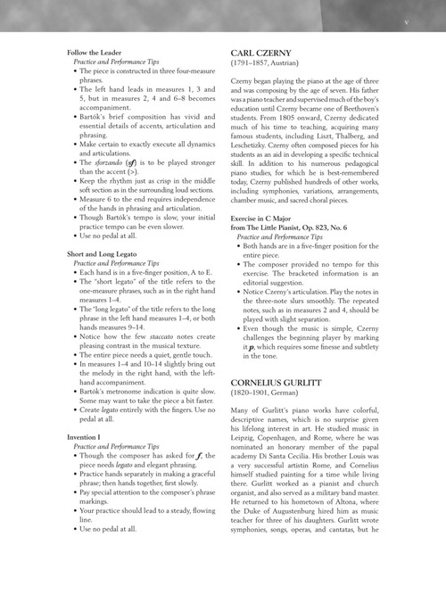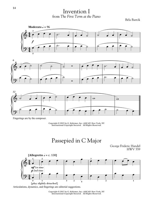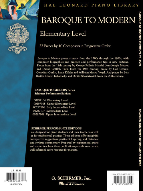 Baroque to Modern presents music from the 1700s through the 1900s, with composer biographies and practice and performance tips in new editions. Pieces from the 18th century by George Frideric Handel, Jean-Joseph Mouret, and Daniel Gottlob Türk. From the 19th century, music by Carl Czerny, Cornelius Gurlitt, Louis Köhler, and Wilhelm Moritz Vogel. And pieces by Béla Bartók, Dmitri Kabalevsky, and Dmitri Shostakovich from the 20th century. Complete contents: BARTOK: Stepping Stones from The First Term at the Piano · Follow the Leader from The First Term at the Piano · Short and Long Legato from The Frist Term at the Piano · Invention I from The First Term at the Piano CZERNY: Exercise in C Major from The Little Pianist, Op. 823, No. 6 GURLITT: Lesson No. 1 from The First Lessons, Op. 117, No. 1 · Lesson No. 2 from The First Lessons, Op. 117, No. 2 · Lesson No. 3 from The First Lessons, Op. 117, No. 3 · Lesson No. 6 from The First Lessons, Op. 117, No. 6 · Lesson No. 9 from The First Lessons, Op. 117, No. 9 HANDEL: Passepied in C Major, HWV 559 KABALEVSKY: Melody from 24 Pieces for Children, Op. 39, No. 1 · Polka from 24 Pieces for Children, Op. 39, No. 2 · Rambling from 24 Pieces for Children, Op. 39, No. 3 · Cradle Song from 24 Pieces for Children, Op. 39, No. 4 · Funny Event from 24 Pieces for Children, Op. 39, No. 7 · Scherzo from 24 Pieces for Children, Op. 39, No. 12 · First Piece from 35 Easy Pieces, Op. 89, No. 1 · Quiet Song from 35 Easy Pieces, Op. 89, No. 3 · At Recess from 35 Easy Pieces, Op. 89, No. 4 · Light and Shadow from 35 Easy Pieces, Op. 89, No. 7 · Little Hedgehog from 35 Easy Pieces, Op. 89, No. 8 · Trumpet and Echo from 35 Easy Pieces, Op. 89, No. 15 · Trumpet and Drum from 35 Easy Pieces, Op. 89, No. 20 KÖHLER: Imitation from The Easiest Exercises, Op. 190, Nos. 13 and 14 · Melody in C Major from The Easiest Exercises, Op. 190, No. 16 · Traveling from The Easiest Exercises, Op. 190, No. 17 MOURET: Fanfare Rondo SHOSTAKOVICH: March from Children's Notebook for Piano, Op. 69, No. 1 · Waltz from Children's Notebook for Piano, Op. 69, No. 2 TÜRK: The Scales from 120 Pieces for the Aspiring Pianist, No. 6 · Sad Feelings from 120 Pieces for the Aspiring Pianist, No. 14 VOGEL: March in C Major Schirmer Performance Editions are designed for piano students and their teachers as well as for professional pianists. These editions offer insightful interpretive suggestions, pertinent fingering, and historical and stylistic commentary. Prepared by experienced artists and master teachers, these publications provide an accurate, well-informed score resource for pianists.