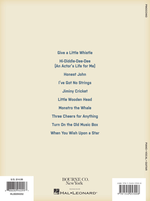 Dez seleções do filme de Walt Disney de 1940, apresentado em Multiplane Technicolor em arranjos para piano, voz e violão. Músicas: Give a Little Whistle · Hi-Diddle-Dee-Dee (An Actor's Life for Me) · Honest John · I've Got No Strings · Jiminy Cricket · Little Wooden Head · Monstro the Whale · Three Cheers for Anything · Turn on the Old Music Box · When You Wish upon a Star.