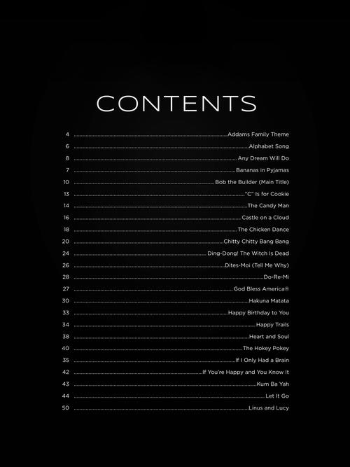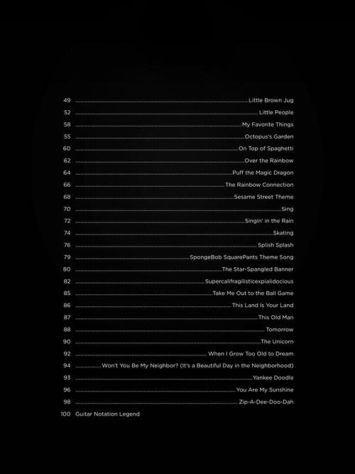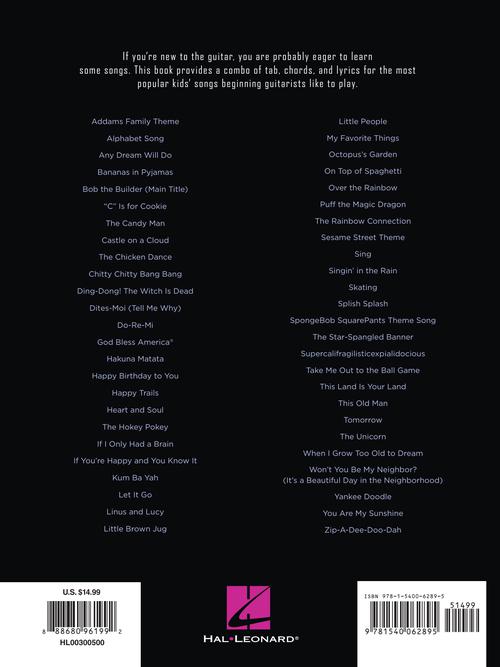 This one-of-a-kind collection provides accessible, must-know children's favorites from pop hits and show tunes to TV themes and folk songs. Songs are presented in a combo of tab, chords, and lyrics for the most popular kids'songs beginning guitarists like to play. Titles include: Addams Family Theme · Alphabet Song · Any Dream Will Do · Castle on a Cloud · The Chicken Dance · Do-Re-Mi · Hakuna Matata · Happy Birthday to You · Heart and Soul · The Hokey Pokey · If You're Happy and You Know It · Kum Ba Yah · Let It Go · My Favorite Things · On Top of Spaghetti · Over the Rainbow · Puff the Magic Dragon · The Rainbow Connection · Sesame Street Theme · Sing · SpongeBob SquarePants Theme Song · Supercalifragilisticexpialidocious · Take Me Out to the Ball Game · Tomorrow · The Unicorn · Won't You Be My Neighbor? (It's a Beautiful Day in the Neighborhood) · You Are My Sunshine · Bob the Builder (Main Title) · and more.