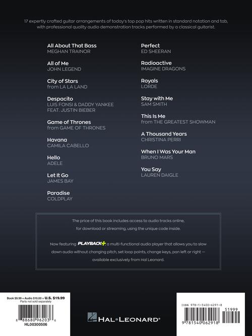 17 arranjos de guitarra habilmente criados dos principais hits pop de hoje escritos em notação e guia padrão, com faixas de demonstração de áudio de qualidade profissional executadas por um guitarrista clássico. As músicas incluem: All of Me · City of Stars · Despacito · Game of Thrones · Havana · Hello · Let It Go · Paradise · Perfect · Royals · This Is Me · A Thousand Years · You Say · e muito mais. O áudio é acessado on-line usando o código exclusivo do livro e pode ser transmitido ou baixado. Os arquivos de áudio incluem o PLAYBACK +, um reprodutor de áudio multifuncional que permite diminuir a velocidade do áudio sem alterar a afinação, definir pontos de loop, alterar teclas e deslocar para a esquerda ou direita.