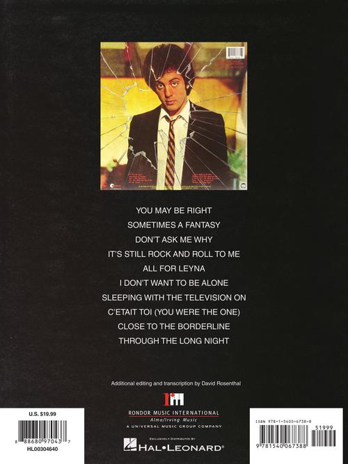 Billy Joel's keyboardist and Music Director David Rosenthal has attentively arranged all the tracks from Joel's 1980 album to combine the piano parts and vocal melodies into playable arrangements with accurate transcriptions of those classic piano parts that are integral to each song. Includes all ten songs, including: All for Leyna · C'etait Toi (You Were the One) · Close to the Borderline · Don't Ask Me Why · I Don't Want to Be Alone · It's Still Rock and Roll to Me · Sleeping with the Television On · Sometimes a Fantasy · Through the Long Night · You May Be Right. Also includes a foreword by David Rosenthal as well as great photos of Billy throughout and copies of his handwritten lyrics.