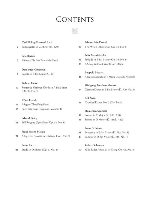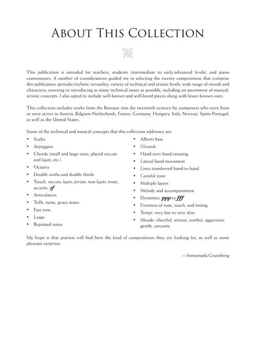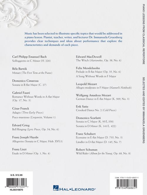 The music in this collection has been selected to illustrate specific topics that would be addressed in a piano lesson. Dr. Immanuela Gruenberg provides clear techniques and ideas about performance that explore the characteristics and demands of each piece. CONTENTS: C.P.E. BACH: Solfeggietto · BARTÓK: Minuet from The First Term at the Piano · CIMAROSA: Sonata in B-flat Major, C. 27 · FAURÉ: Romance Without Words, Op. 17, No. 3 · FRANCK: Adagio from Three Early Pieces · FRANCK: Poco maestoso from L'organiste, Volume 1 · GRIEG: Bell Ringing from Lyric Pieces, Op. 54, No. 6 · HAYDN: Allegretto from Sonata in C Major, Hob. XVI:3 · LISZT: Etude in D Minor, Op. 1, No. 4 · MACDOWELL: The Witch from Marionettes, Op. 38, No. 6 · MENDELSSOHN: Prelude in B-flat Major, Op. 35, No. 6 · MENDELSSOHN: A Song Without Words in F Major · L. MOZART: Allegro moderato in F Major from Nannerl's Notebook · W.A. MOZART: German Dance, K. 509, No. 3 · SATIE: Crooked Dance No. 2 from Cold Pieces · D. SCARLATTI: Sonata in C Major, K. 95/L. 358 · D. SCARLATTI: Sonata in D Minor, K. 141/L. 422 · SCHUBERT: Ecossaise, D. 735, No. 3 · Landler, D. 145, No. 7 · SCHUMANN: Wild Rider from Album for the Young, Op. 68, No. 8