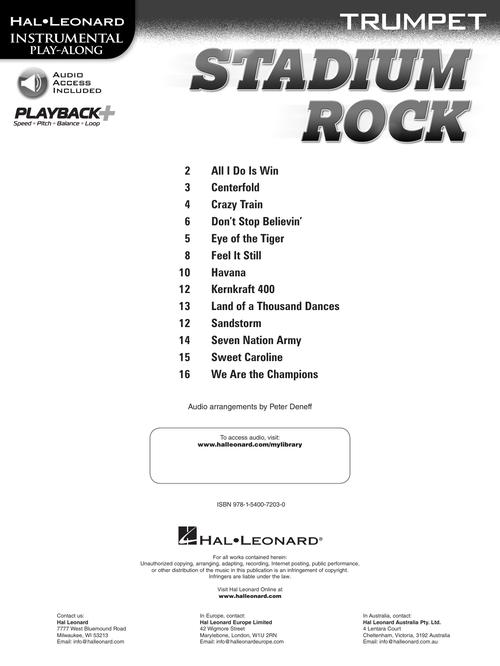 13 songs guaranteed to get the fans fired up, including: Crazy Train · Don't Stop Believin' · Eye of the Tiger · Havana · Seven Nation Army · Sweet Caroline · We Are the Champions · and more. Songs are arranged for instrumentalists and feature access to great demonstration and backing tracks so they can play along and sound like a pro! Audio is accessed online using the unique code inside the book and can be streamed or downloaded. The audio files include PLAYBACK+, a multi-functional audio player that allows you to slow down audio without changing pitch, set loop points, change keys, and pan left or right.