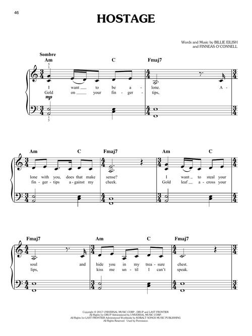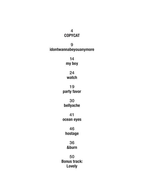 Arranjos fáceis para piano com letras para todas as faixas do seu EP de estréia, com destaque: Bellyache · Copycat · Hostage · Idontwannabeyouanymore · My Boy · Ocean Eyes · Party Favor · Watch plus &burn and Lovely.