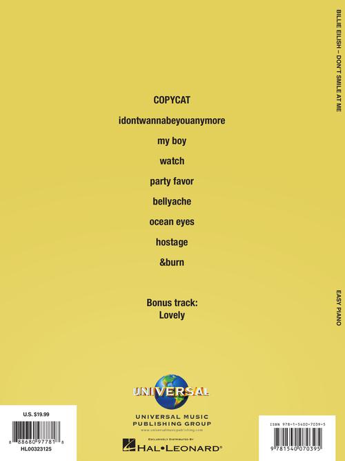 This songbook features easy piano arrangements with lyrics for all the tracks on her attention-grabbing debut EP featuring: Bellyache • Copycat • Hostage • Idontwannabeyouanymore • My Boy • Ocean Eyes • Party Favor • Watch plus “&burn” and “Lovely.”