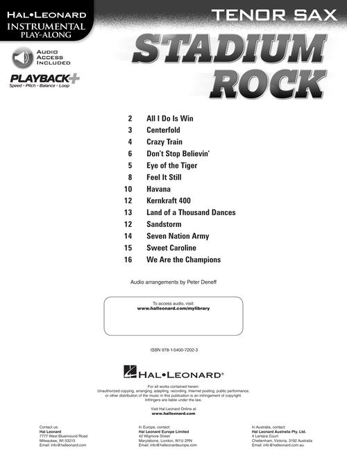 13 songs guaranteed to get the fans fired up, including: Crazy Train · Don't Stop Believin' · Eye of the Tiger · Havana · Seven Nation Army · Sweet Caroline · We Are the Champions · and more. Songs are arranged for instrumentalists and feature access to great demonstration and backing tracks so they can play along and sound like a pro! Audio is accessed online using the unique code inside the book and can be streamed or downloaded. The audio files include PLAYBACK+, a multi-functional audio player that allows you to slow down audio without changing pitch, set loop points, change keys, and pan left or right.